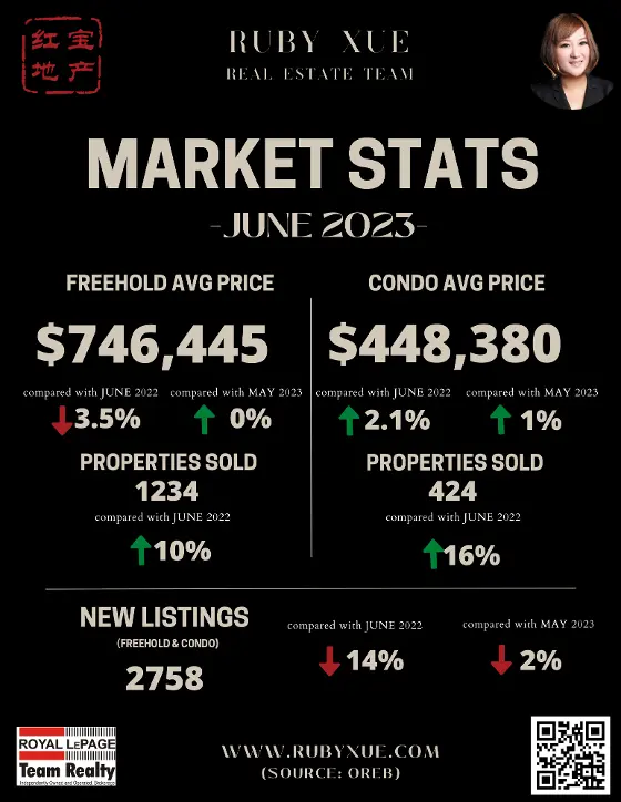 The average sale price for a freehold-class property in June was $746,445, a decrease of 4% from 2022, but still on par with May 2023 prices.
