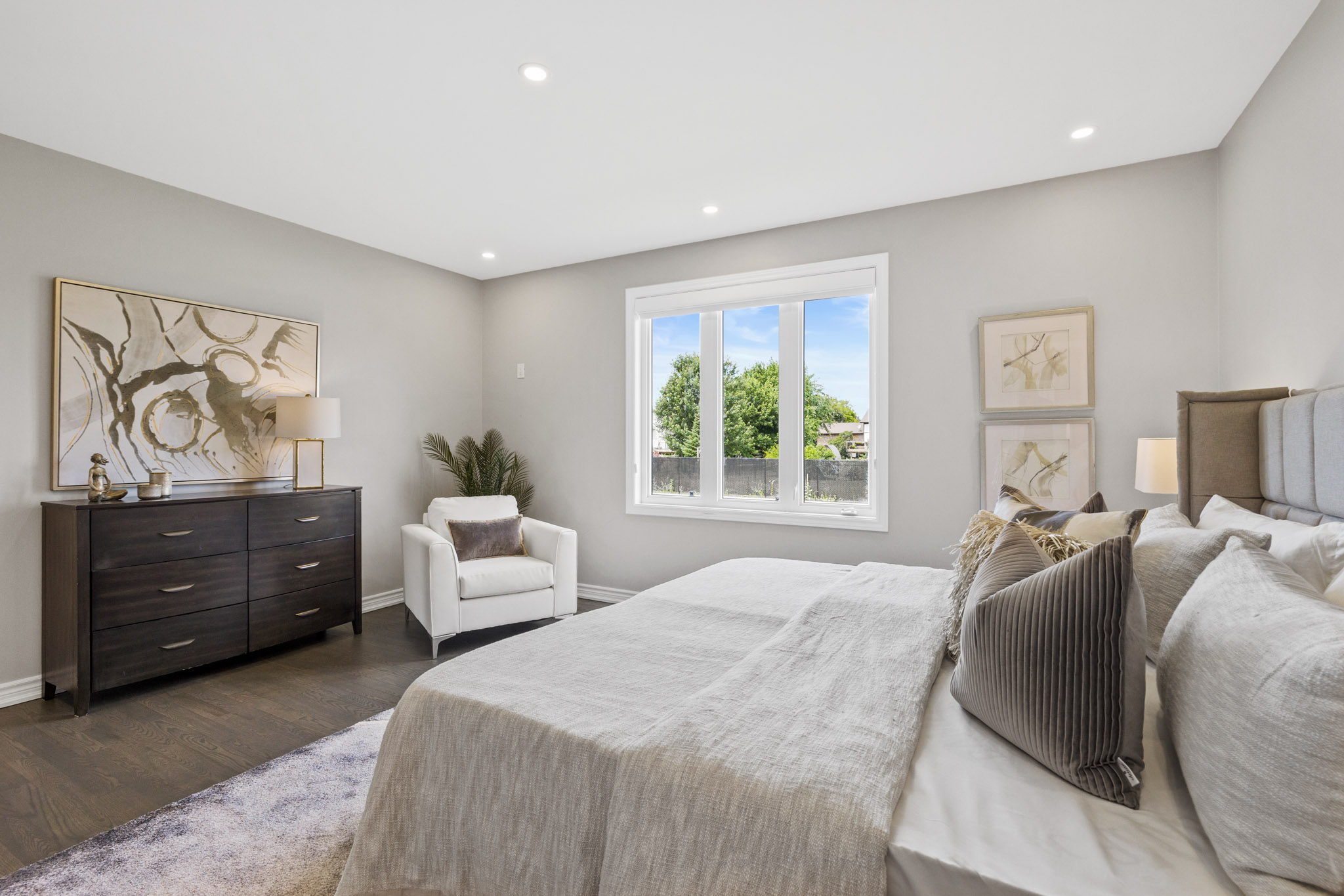 主卧室设有豪华套内浴室及步入式衣帽间。地下室配备吧台及宽敞娱乐空间,另设两个额外卧室及一间完整卫浴。